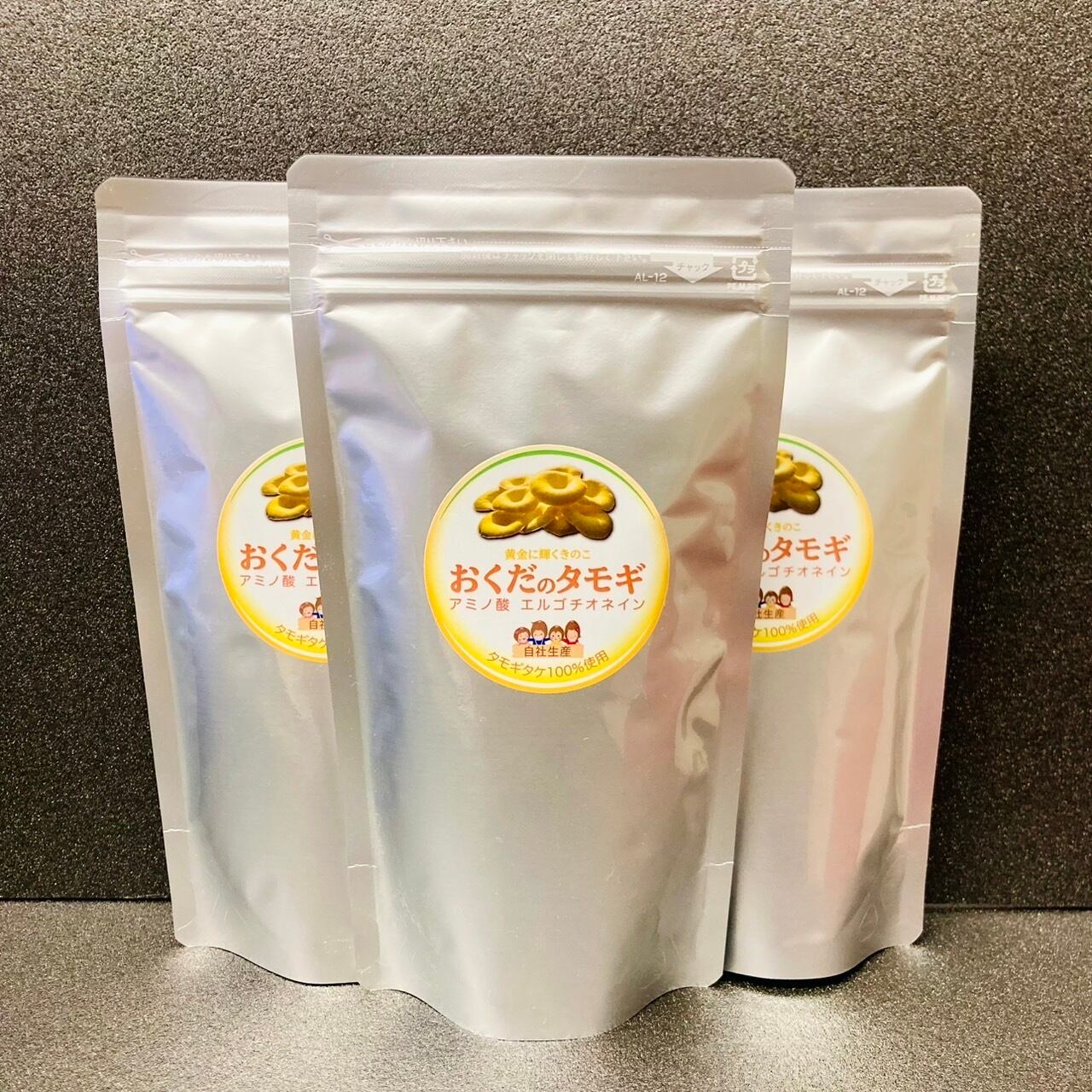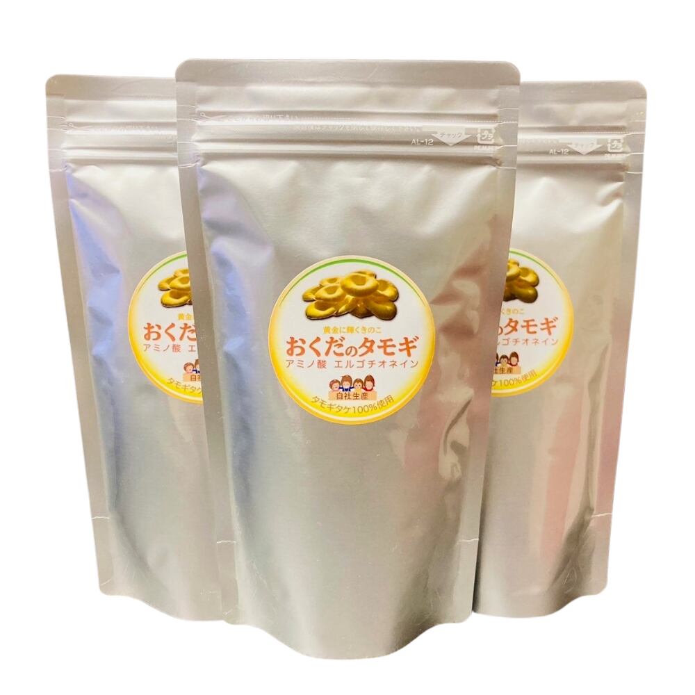 自社栽培のタモギタケのみを使用し、添加物を一切加えずに粉末にした「おくだのタモギ」の100g×3袋セットです。1日3gの使用で約90日分に相当します。