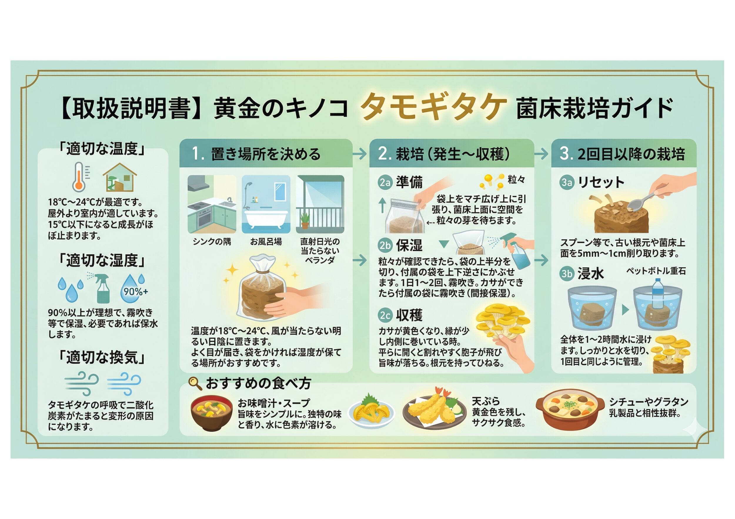 - タモギタケの場合: 18〜25℃前後、湿度90%以上、換気のある環境が適しています。