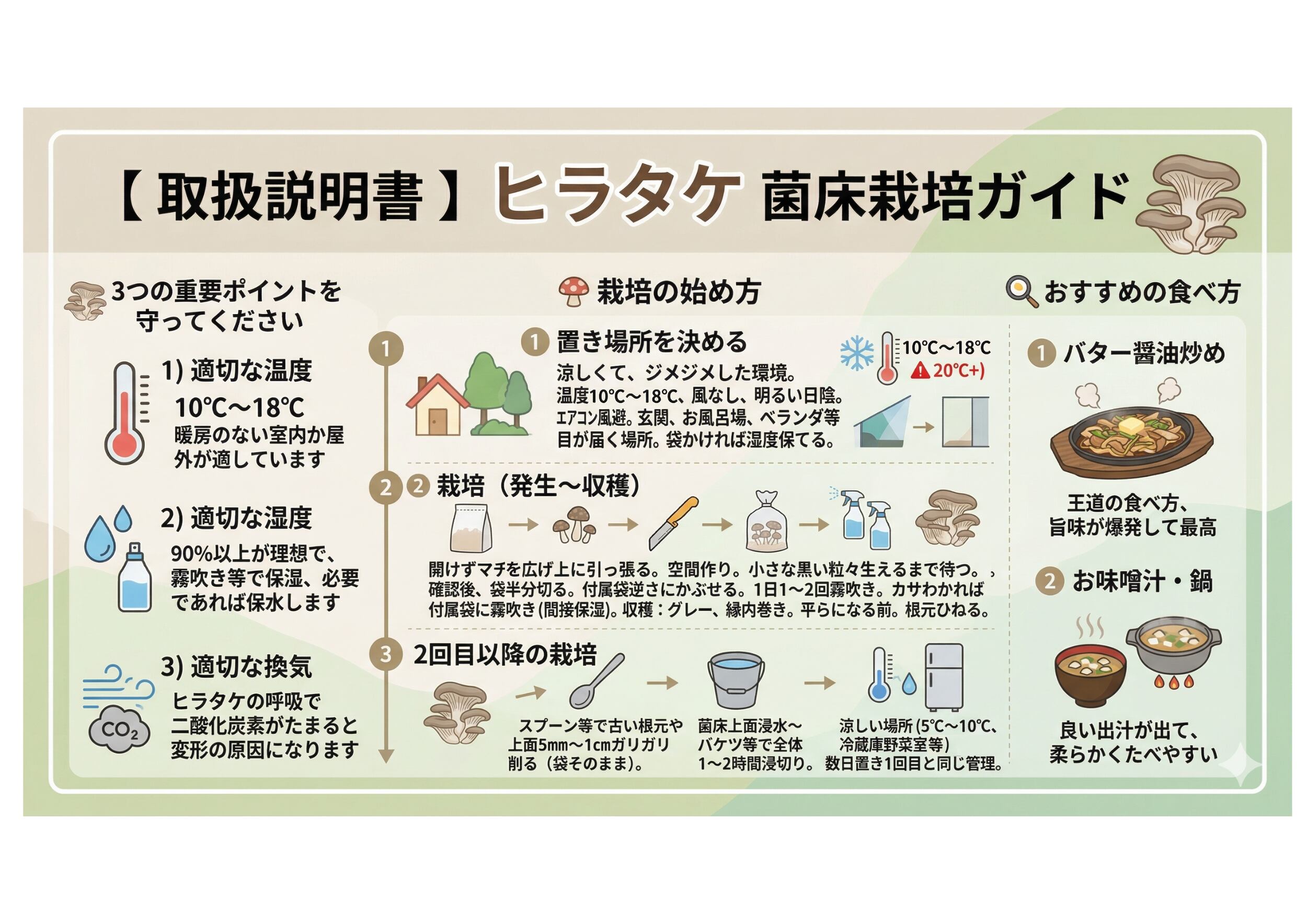 - ヒラタケの場合: 10〜18℃前後、湿度90%以上、換気のある環境が適しています。